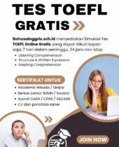 Simulasi Tes TOEFL Online Gratis 24 Jam — Tes Online Bahasa Inggris Bersertifikat Resmi BahasaInggris.sch.id menyediakan Simulasi Tes TOEFL Online Gratis yang dapat diikuti kapan saja, 7 hari dalam seminggu,…