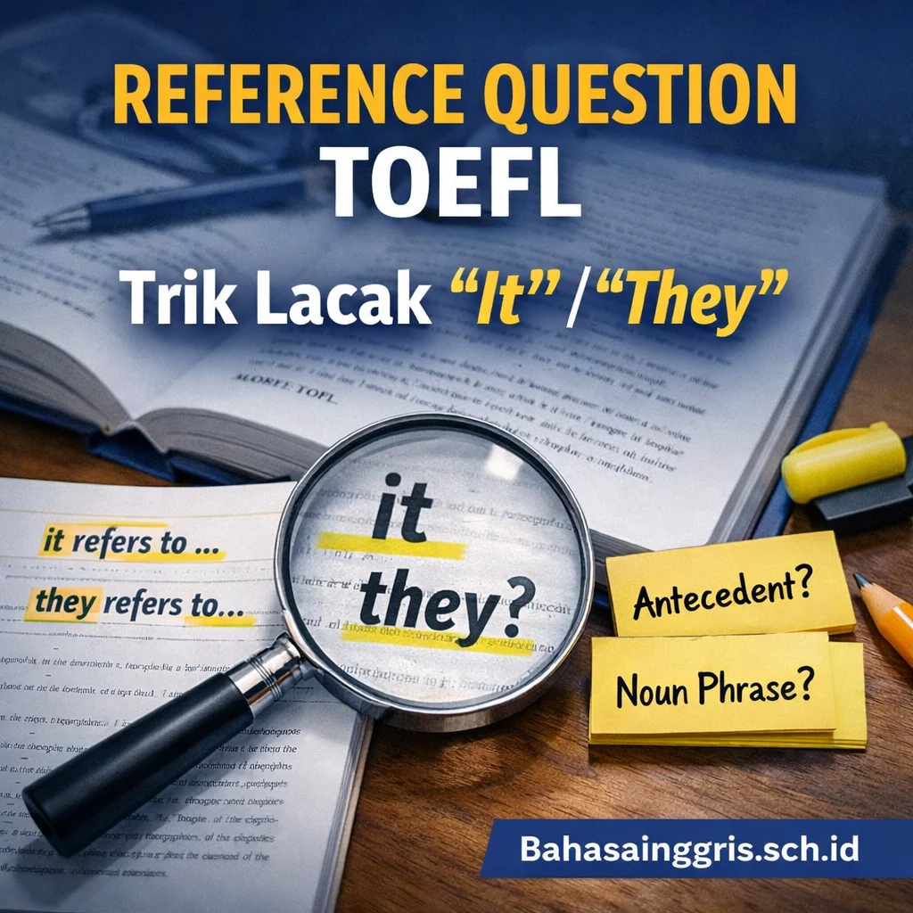 Reference question TOEFL adalah tipe soal Reading yang menanyakan kata rujukan seperti it/they/these pada teks. Soal ini untuk peserta TOEFL ITP yang ingin menemukan antecedent tanpa membaca ulang seluruh paragraf. Dengan melacak noun phrase terdekat dan uji substitusi, Anda bisa menjawab lebih cepat dan lebih akurat.