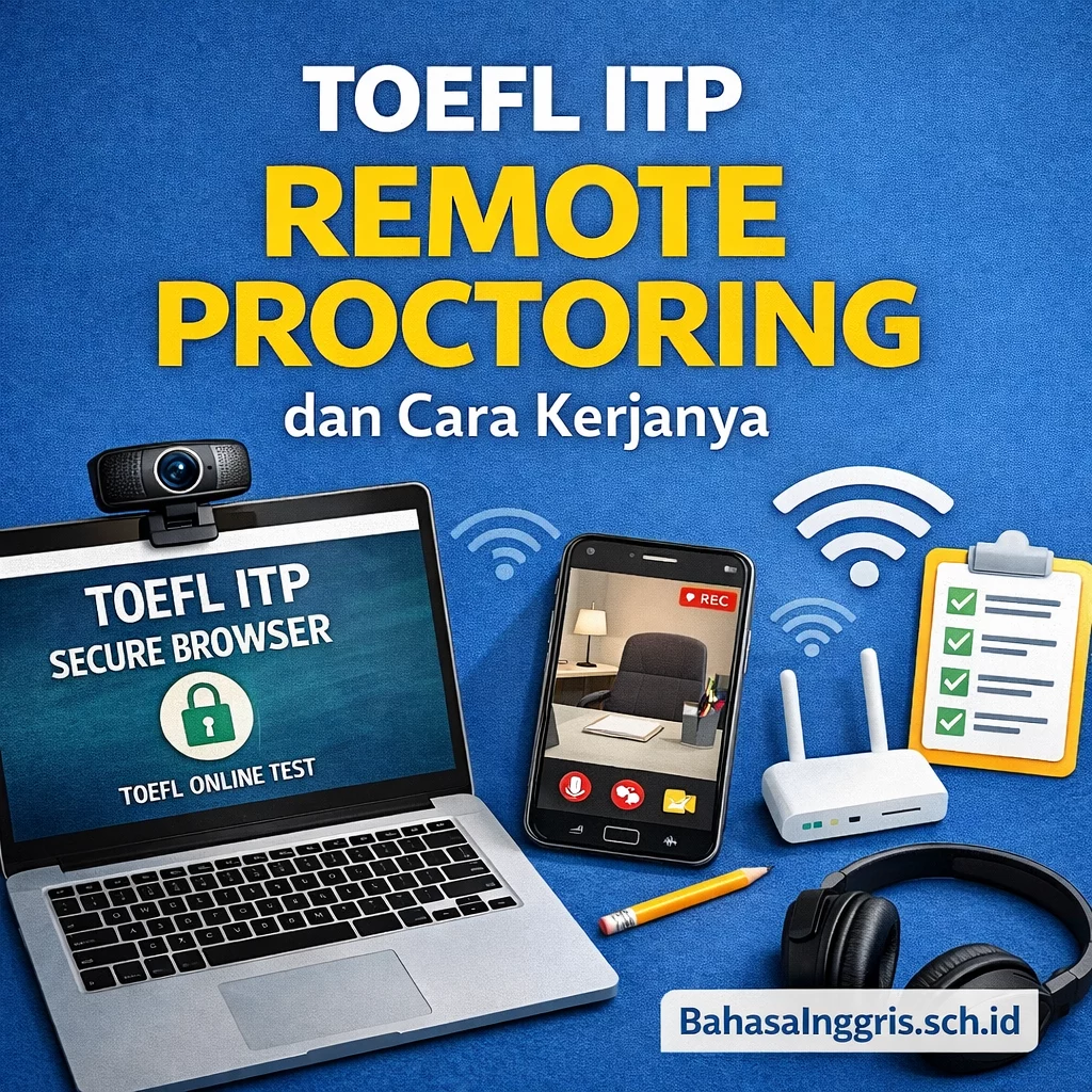 TOEFL ITP Remote Proctoring adalah pelaksanaan TOEFL ITP resmi secara online dari rumah atau lokasi peserta, dengan pengawasan jarak jauh selama tes berlangsung. ETS menjelaskan TOEFL ITP sebagai bagian dari TOEFL ITP Assessment Series, sedangkan pelaksanaan remote proctoring pada praktik lapangan dipadukan dengan kontrol teknis tambahan agar ujian tetap berlangsung dalam lingkungan yang diawasi dan lebih aman. Format ini berkembang karena banyak peserta membutuhkan akses tes resmi tanpa harus hadir fisik di satu lokasi tertentu.